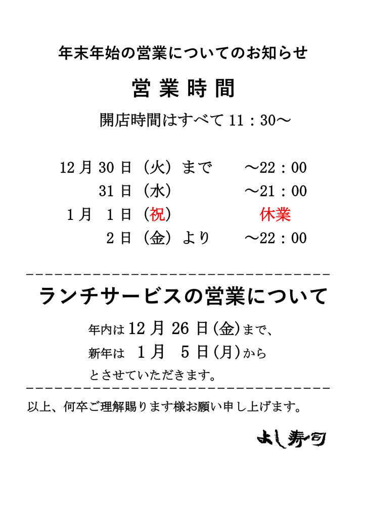 年末年始の営業について